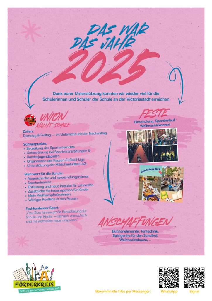 Der Förderkreis – Schule an der Victoriastadt e. V. wurde 2010 gegründet, um genau dort zu helfen, wo die Möglichkeiten von Schule und Stadt an ihre Grenzen stoßen. Seitdem setzen wir uns mit viel Herzblut dafür ein, das Schulleben bunter, lebendiger und besser ausgestattet zu machen.